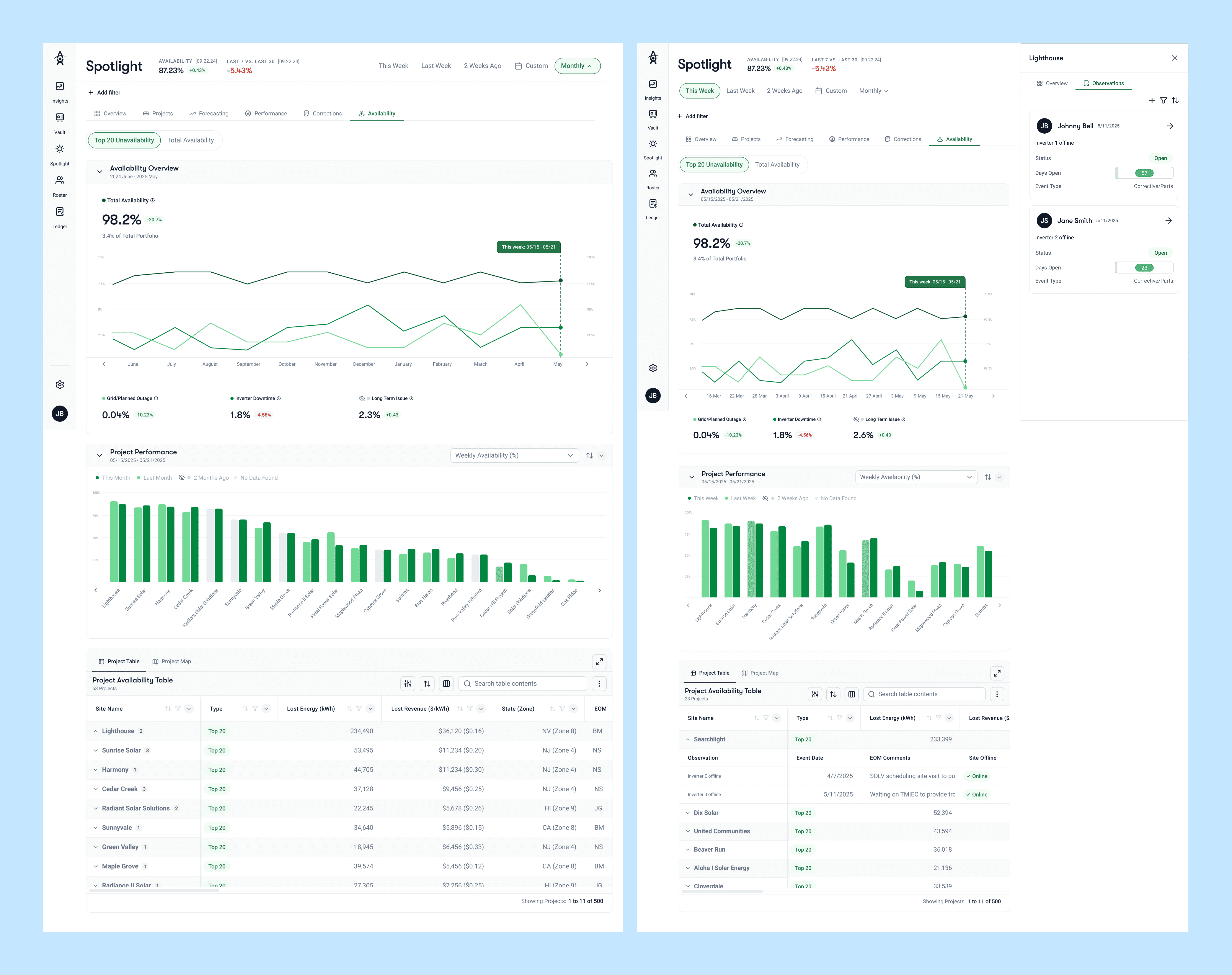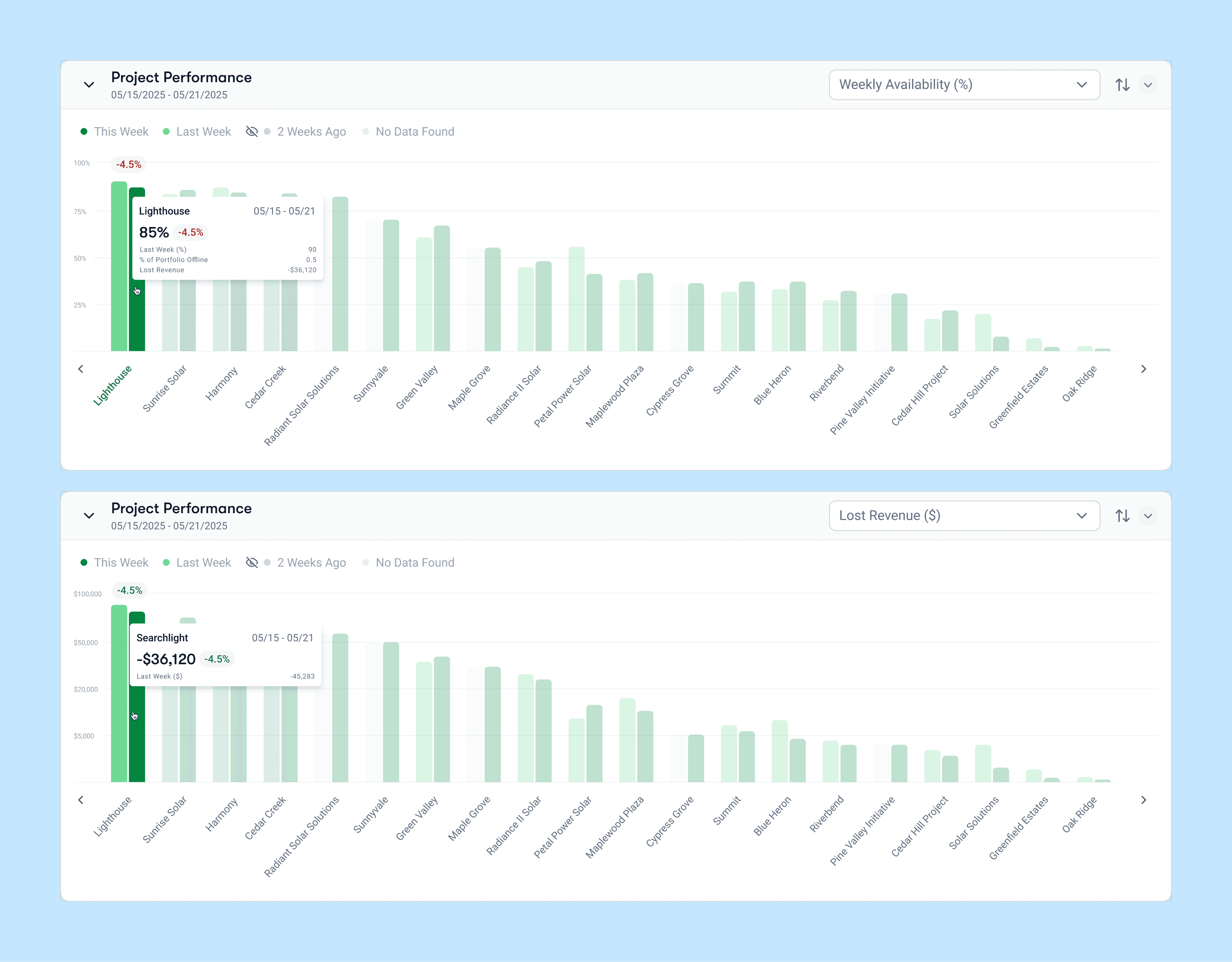 View weekly availability and lost revenue for each project and how it performs the week before.